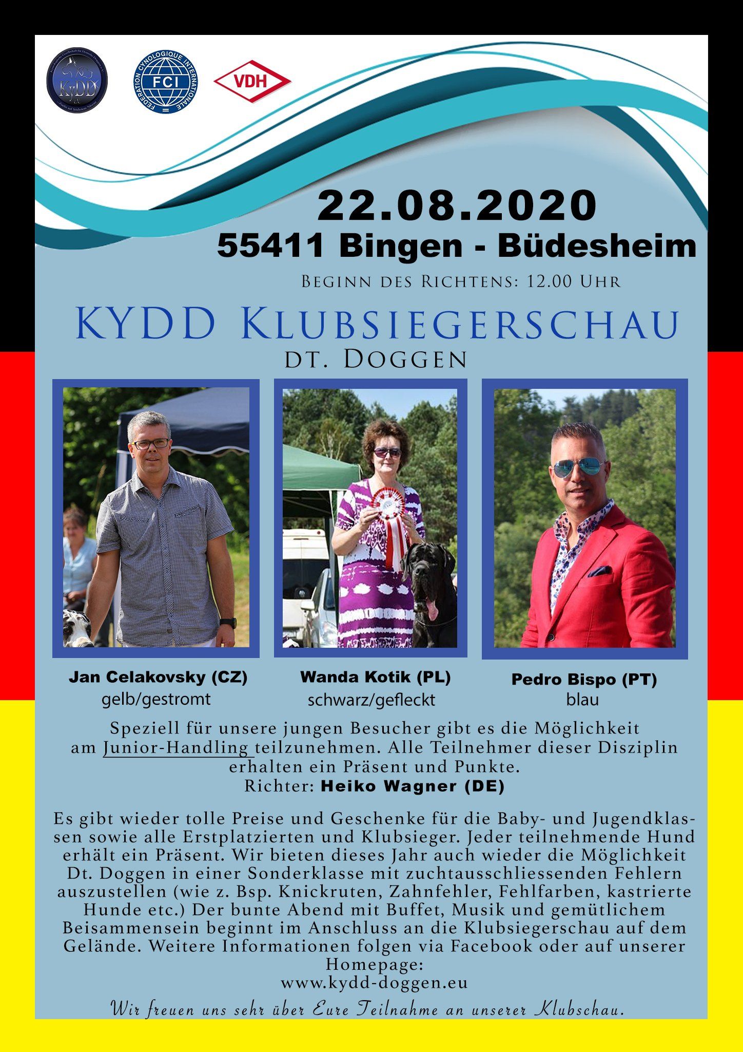 The Klubsiegerschau is the KyDD exhibition event of the year: international top judges, junior handling for the offspring, a special class for dogs with characteristics that exclude breeding and a splendid "colorful evening" following the exhibition offer excitement, fun and networking for breeders, Owners and people interested in Great Danes. Registration forms can be downloaded directly below!